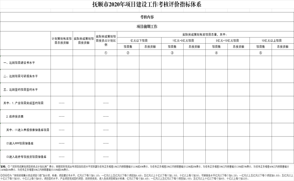 项目前期工作基础分为30分,完成全年项目建议书水平得基础分5分,完成全年可研报告水平得基础分10分,完成全年项目签约水平的基础分15分。在项目规模上设有加分项。