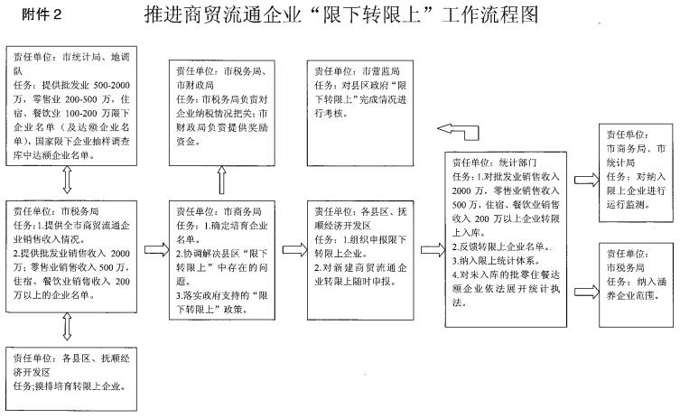 (二)深入挖掘升限潜力。要优先鼓励支持工业企业剥离生产性服务业务,成立销售公司,以批发、零售等业态纳入限上统计;优先鼓励支持批发市场和部分已退出的租赁企业,提高经营水平,逐步升级和再次转为限上企业;优先为新开业的大中型批零住餐企业提供优质服务,及时入库;积极协调总部分支机构按照属地统计的原则上报数据,优先纳入我市限上企业数据中。(责任单位:市商务局、市统计局、省统计局抚顺市调查队、市税务局、市工商局)
