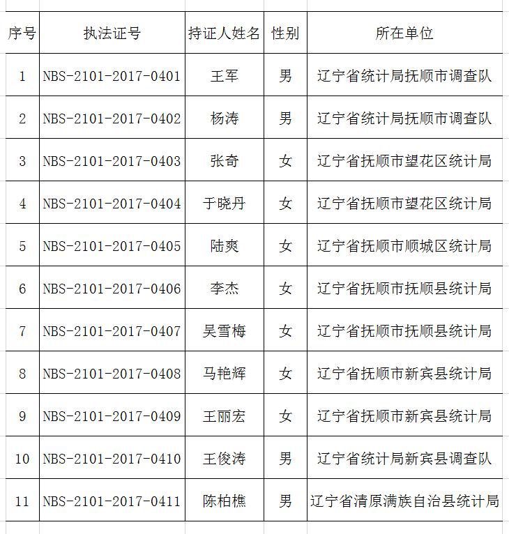抚顺市统计执法证持有人员信息
